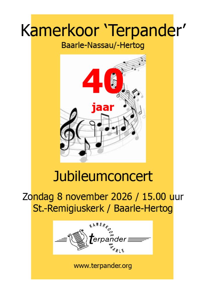 I.v.m. het 40 jarig bestaat van kamerkoor Terpander vindt er op zondag 8 november om 15 uur een jubileumconcert plaats in de Remigiuskerk in Baarle-Hertog.